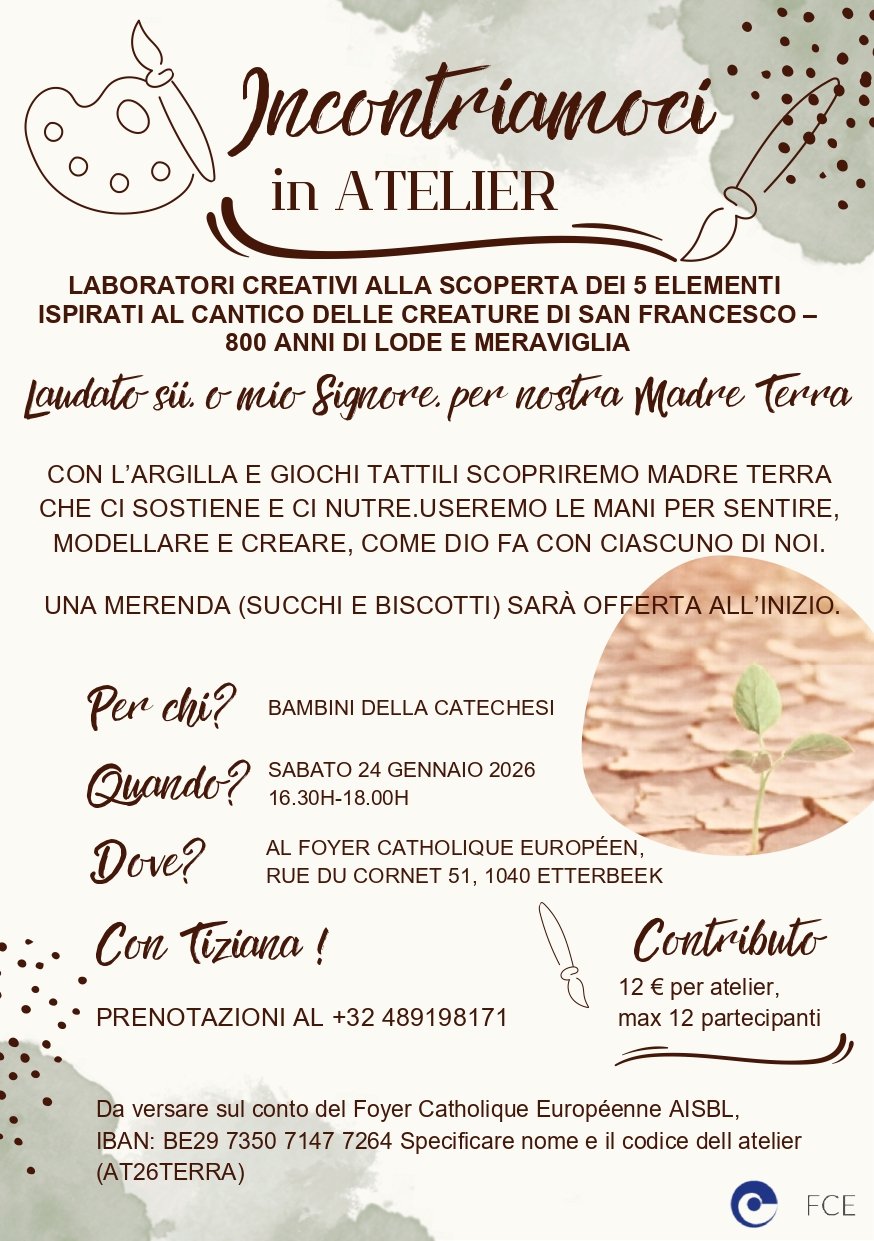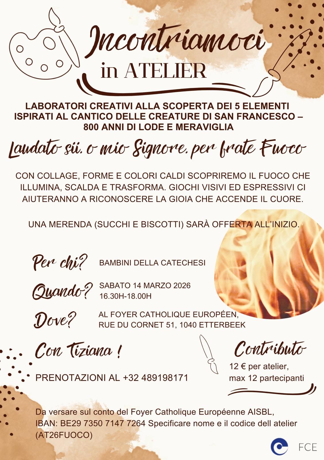 Per l’atelier è richiesta un’iscrizione di €12,00 da versare sul conto del Foyer Catholique Européen AISBL,