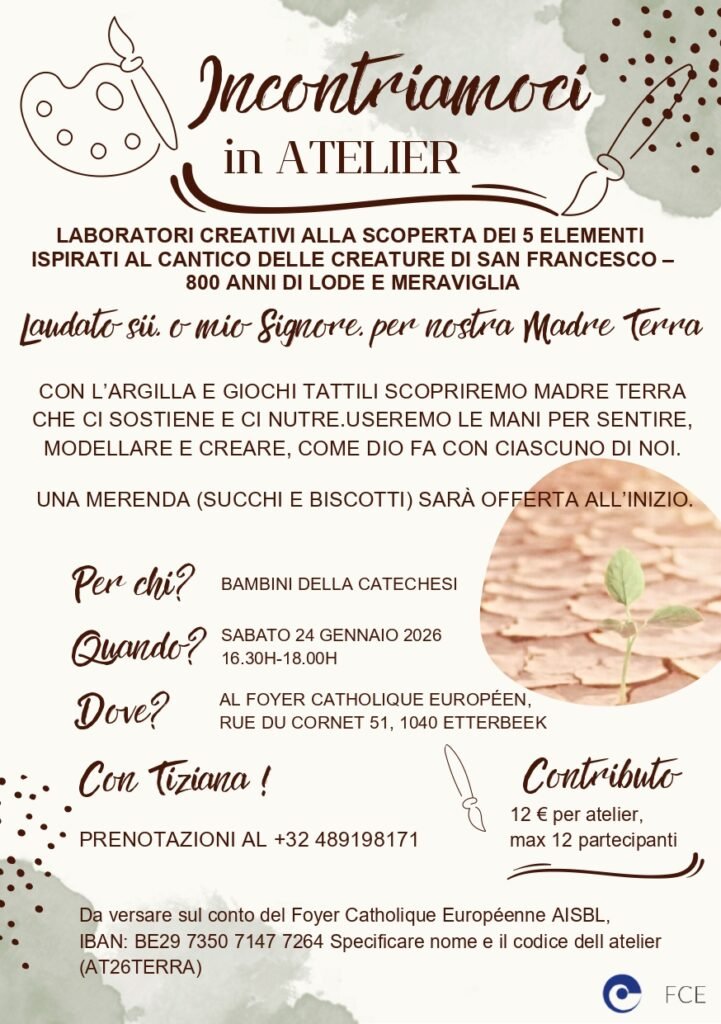 Home Events - Comunità Italiana Bruxelles Atelier Atelier per bambini Atelier per bambini Ciclo laboratori creativi Argilla, pittura, collage, land art e tanto altro… + Aggiungi a Google Calendar + iCal / Outlook export Tags: atelier Data 08 Nov 2025 Expired! Ora 16:30 - 18:00 Luogo Foyer Catholique Européen Rue du Cornet, 51 Bruxelles Sito web https://fce.be/ Categoria Atelier Prossimo evento Preghiera carismatica Comunità Gesù Risorto Data 27 Gen 2026 Ora 19:00 - 20:00 Condividi questo evento
